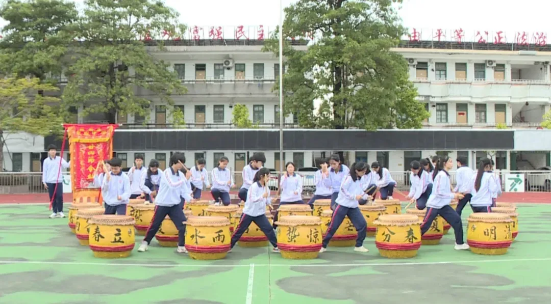 走近东凤中学的操场,一阵气势澎湃的鼓声配合着中气十足的呐喊声传来,只见二十四节令鼓队的成员们动作整齐划一,以敲击与肢体表演动作,展现各节气的不同气象、人文及民俗。据了解,该校早在2015年就设立二十四节令鼓队,并聘请校外专业教练定期为鼓队学生进行培训。