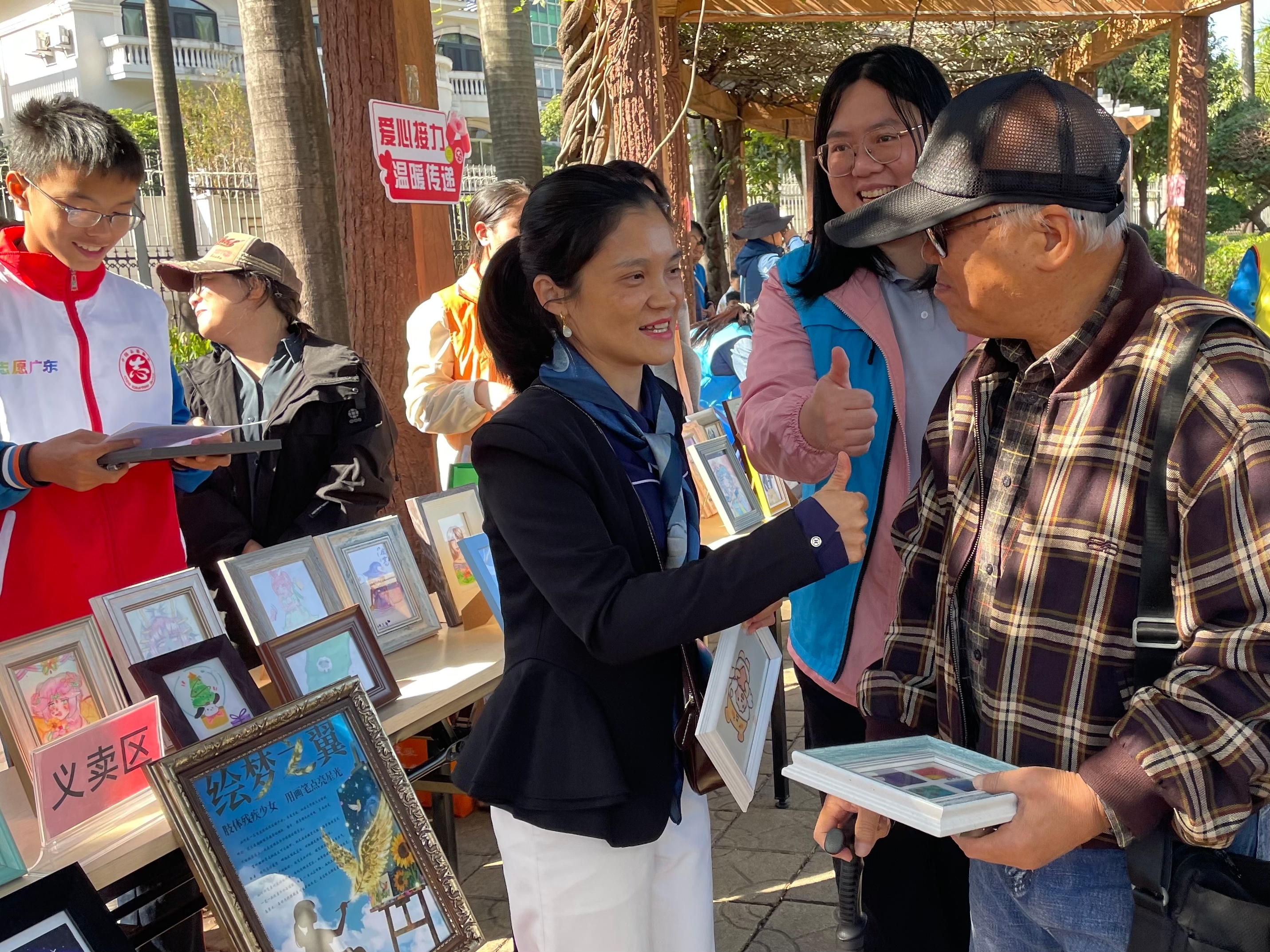 活动现场热闹而有序,口腔义诊、慈善义卖、科普宣传、兜底民生政策解读、反诈与消防安全宣传、垃圾分类有奖游戏、亲子跳蚤市场等多个特色摊位一字排开,全方位满足居民的多元需求。在义卖摊位前,居民们纷纷慷慨解囊,购买志愿者制作的气球,并将善款直接捐入广碧社区慈善基金。尤为引人注目的是,慈善义卖区的困境儿童画作备受关注,而残疾人小可的个人画展及作品义卖专区更是成为全场的焦点所在。